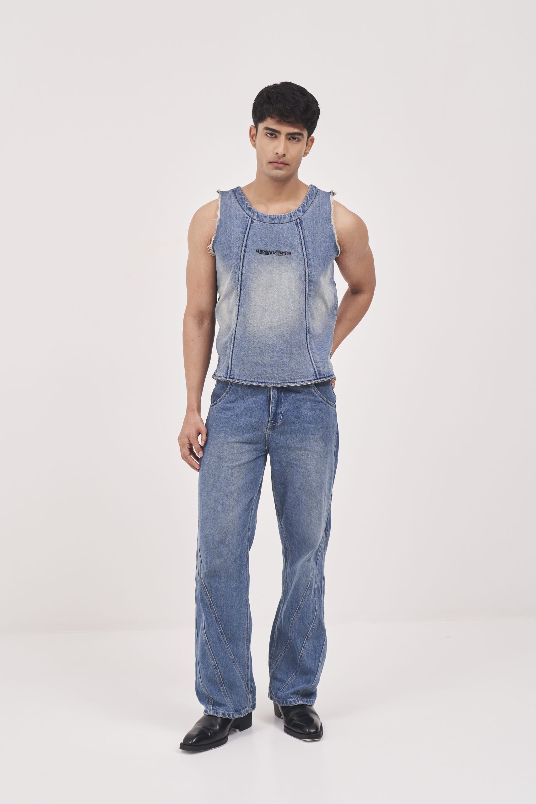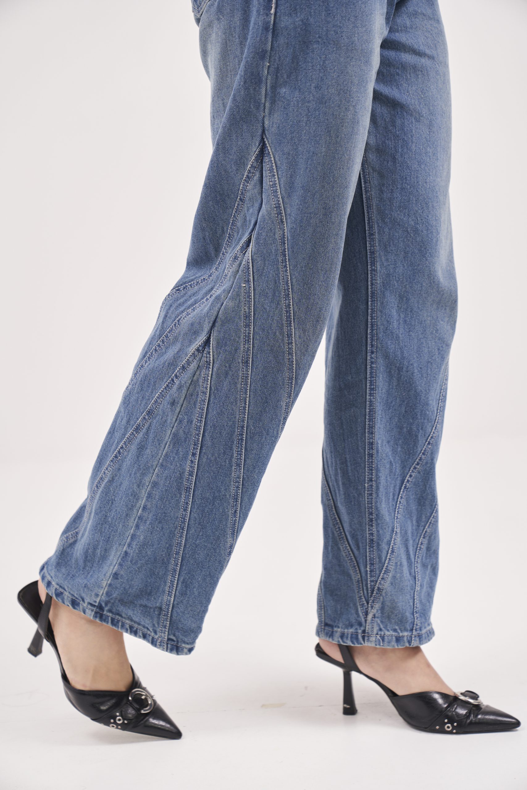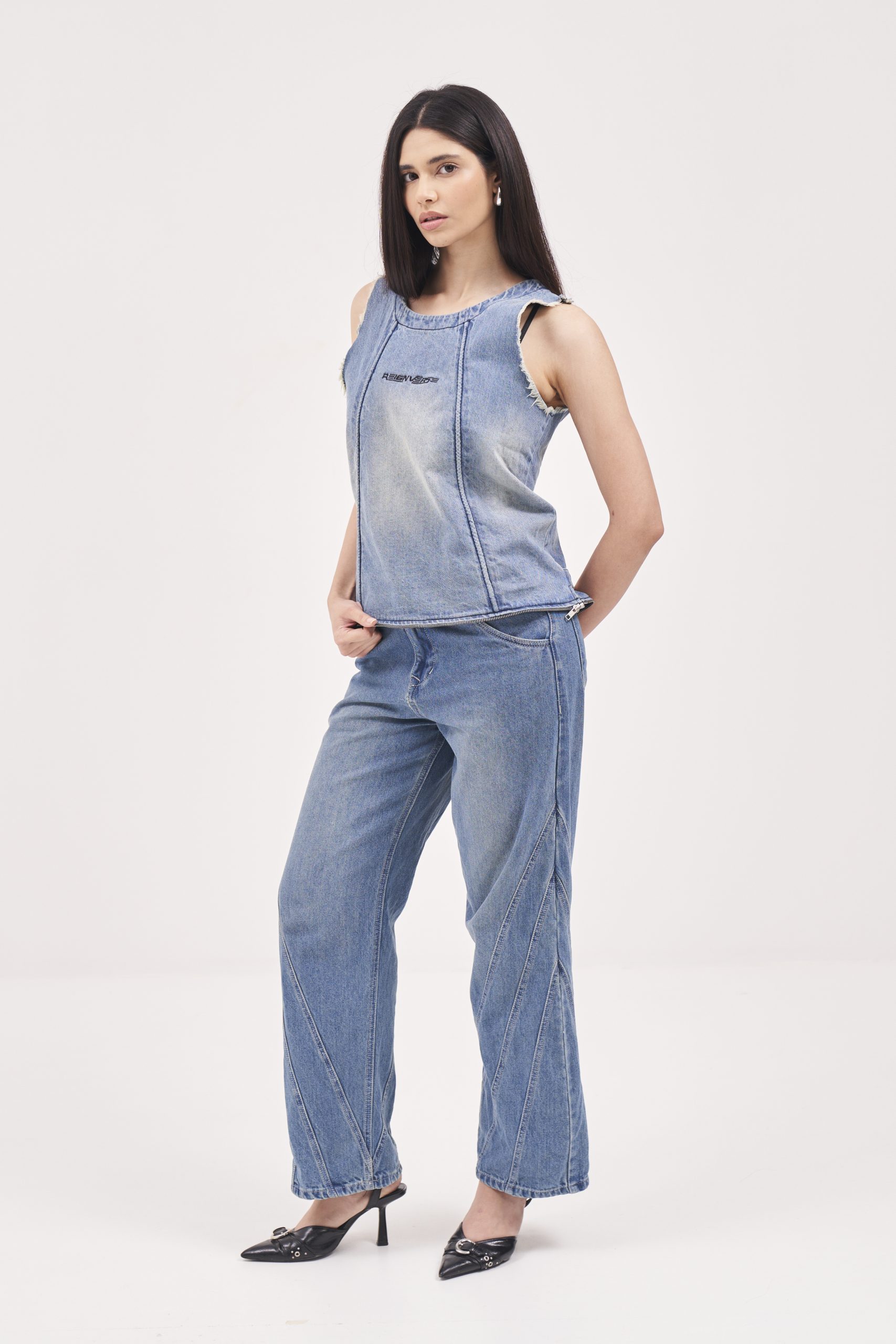 Blue denims having seam line detailing on the sides. Embroidered branding at back of waistband.