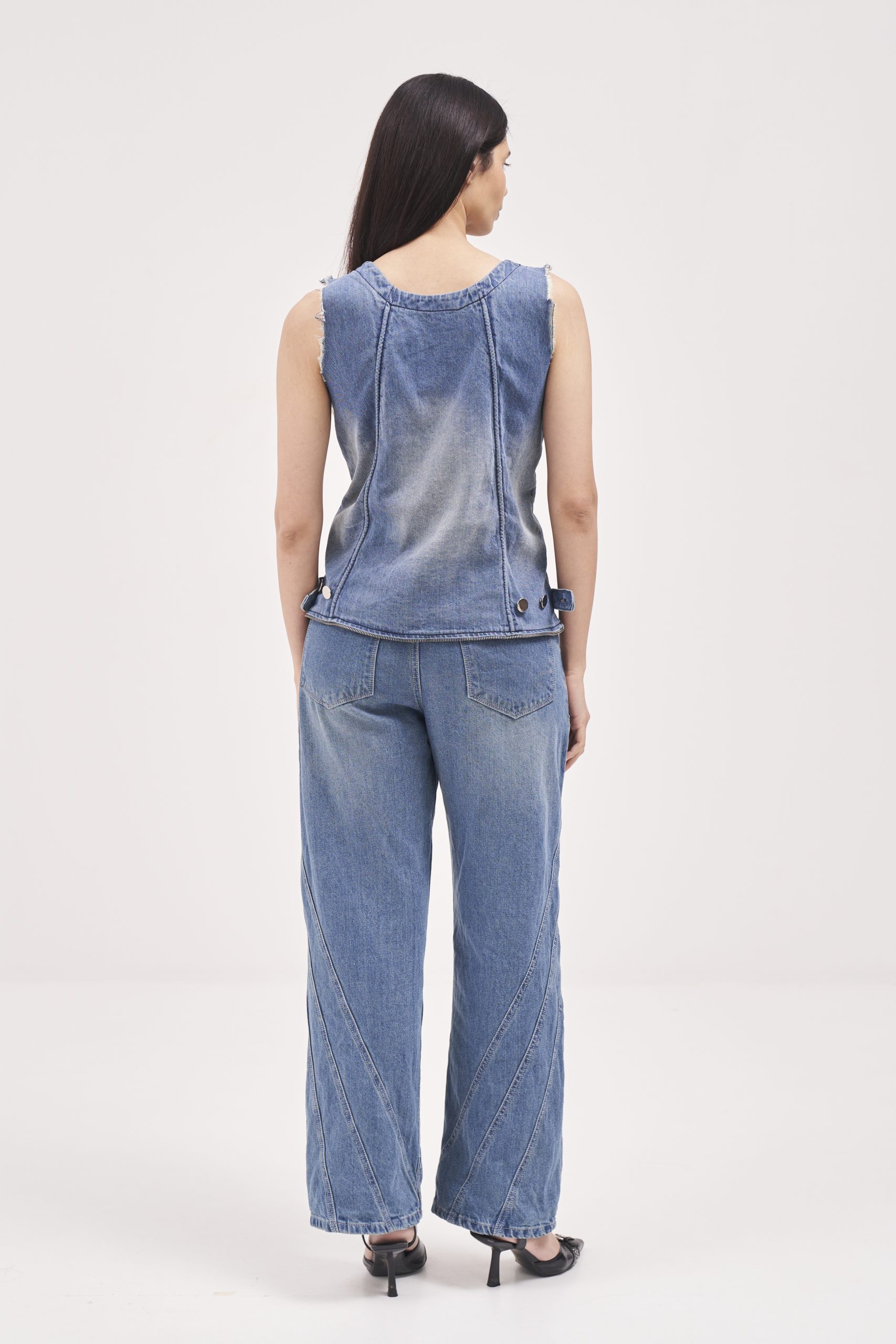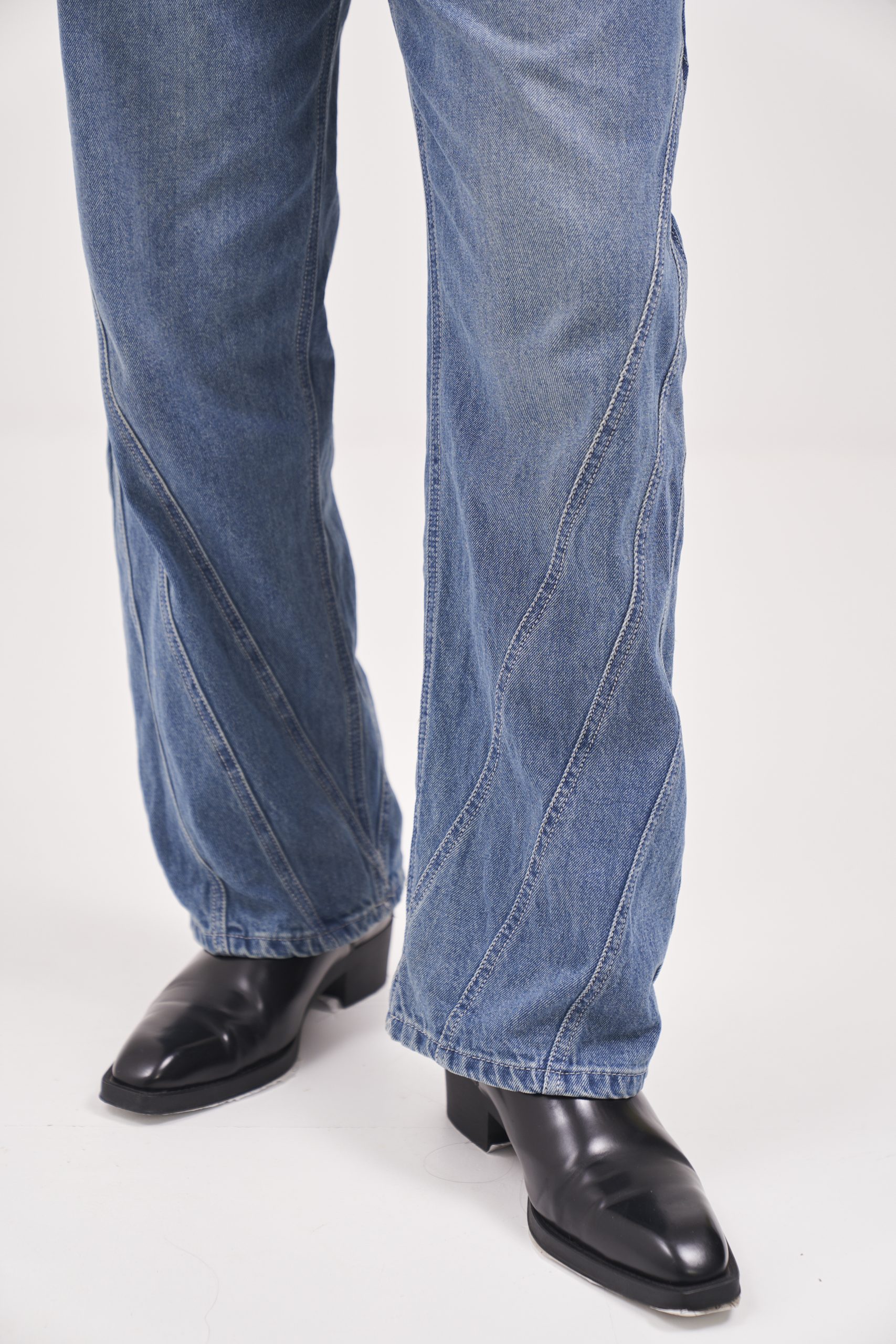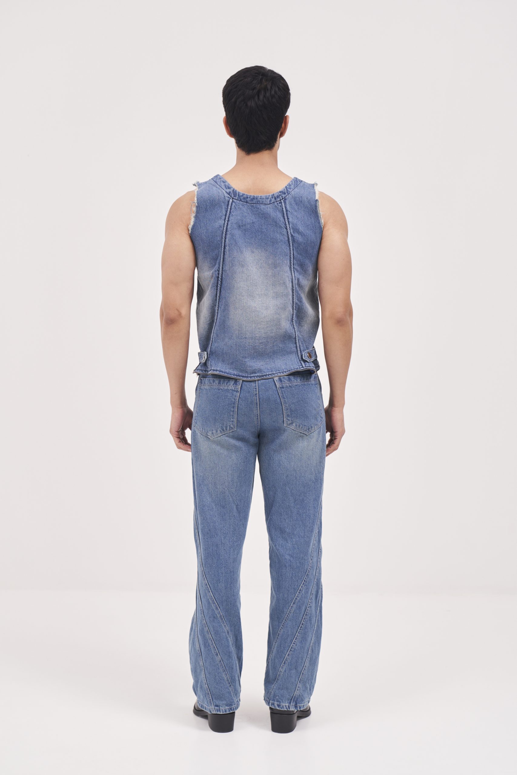 Blue denims having seam line detailing on the sides. Embroidered branding at back of waistband.