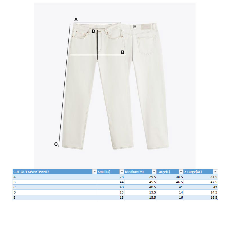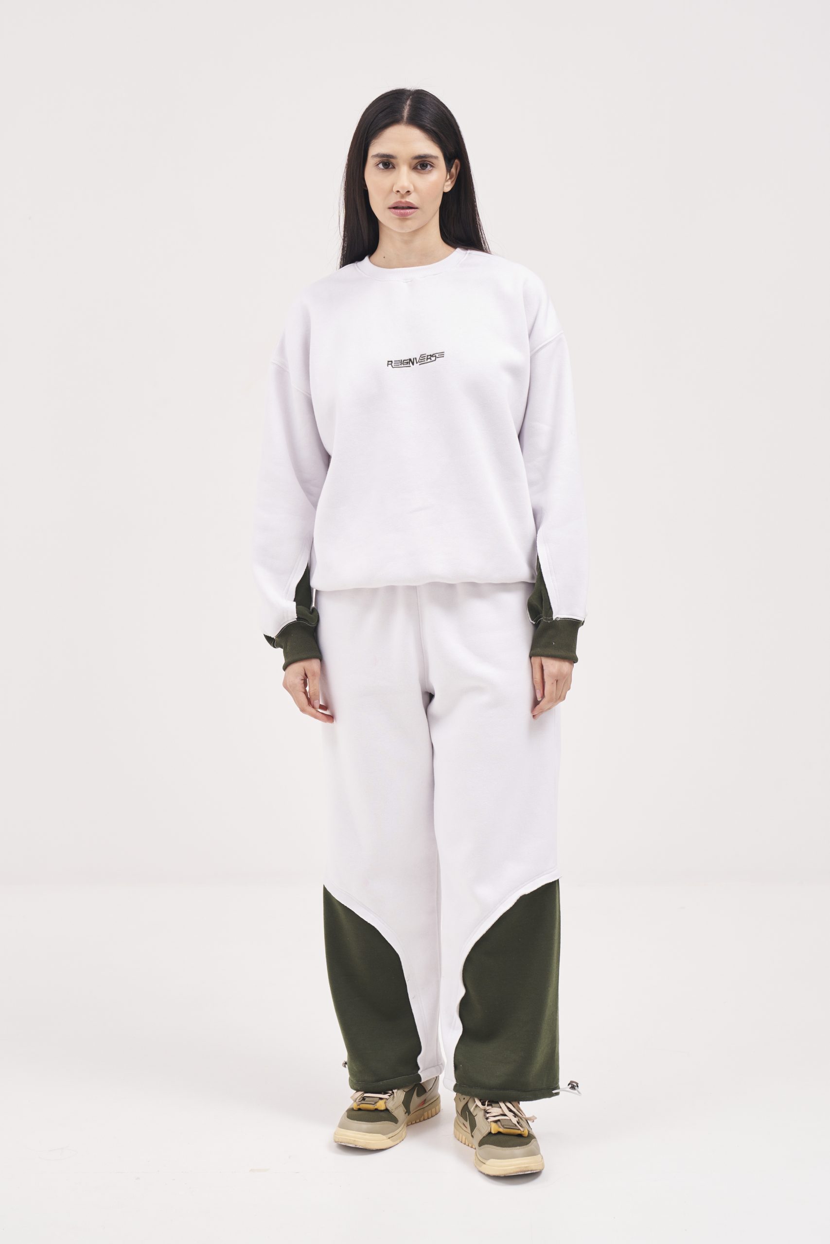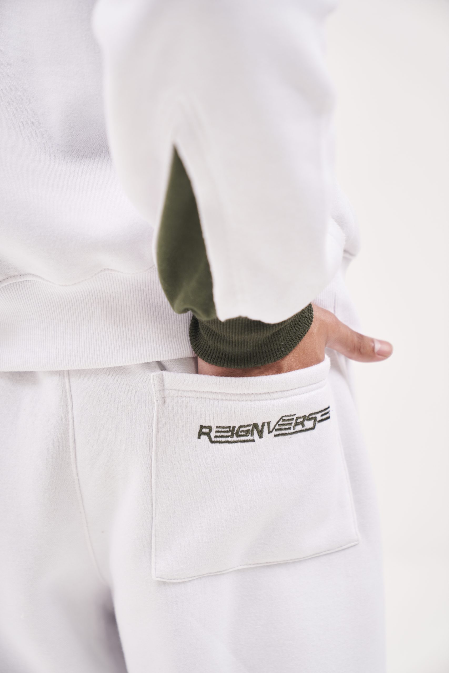 White Sweatpants having bottle green cutouts at the bottom. Branding embroidered on back pocket. Fastener draw strings attached at the bottom for added convenience.