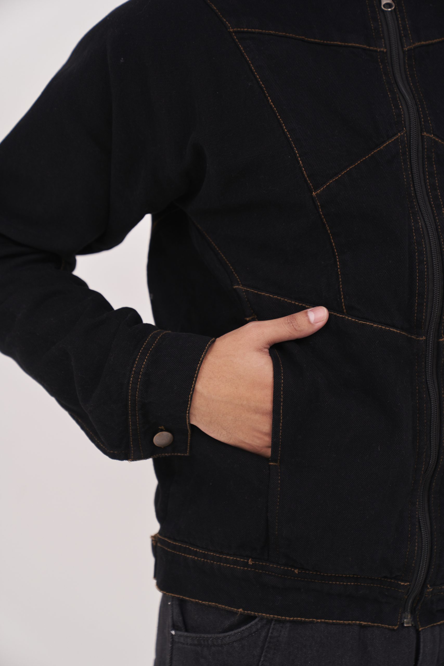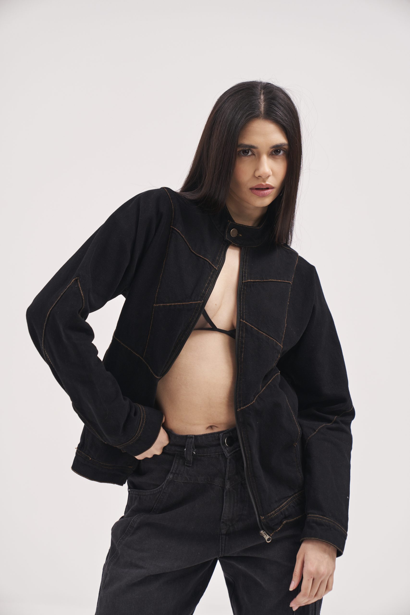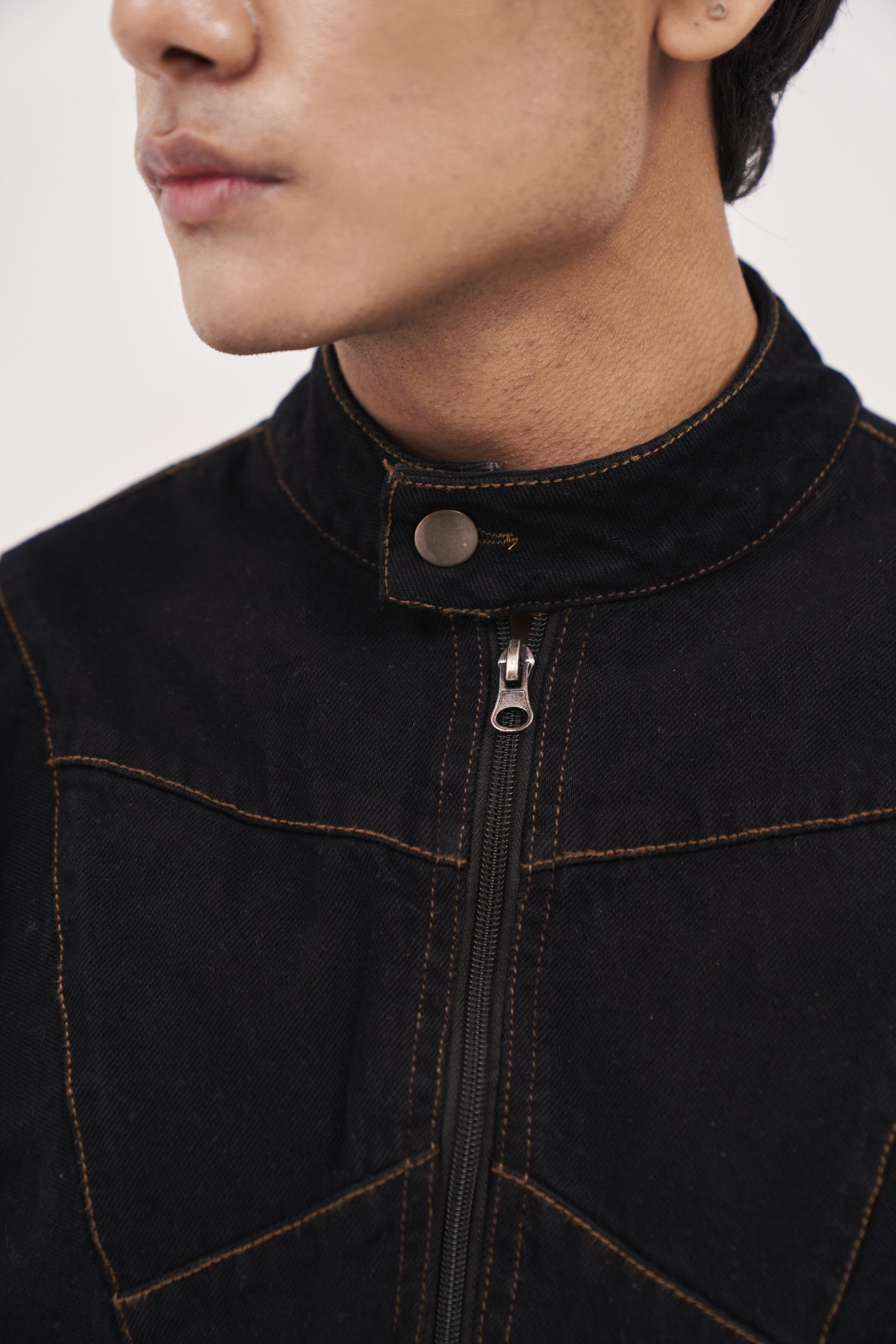 Black Denim biker jacket with button at the neck. Pockets at the front. Visible sewing as a design element.