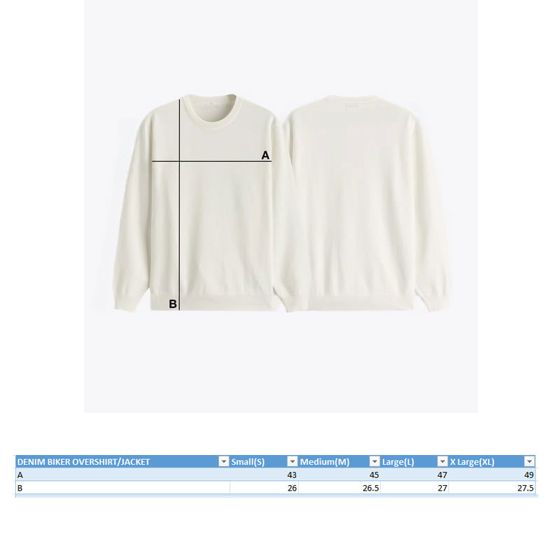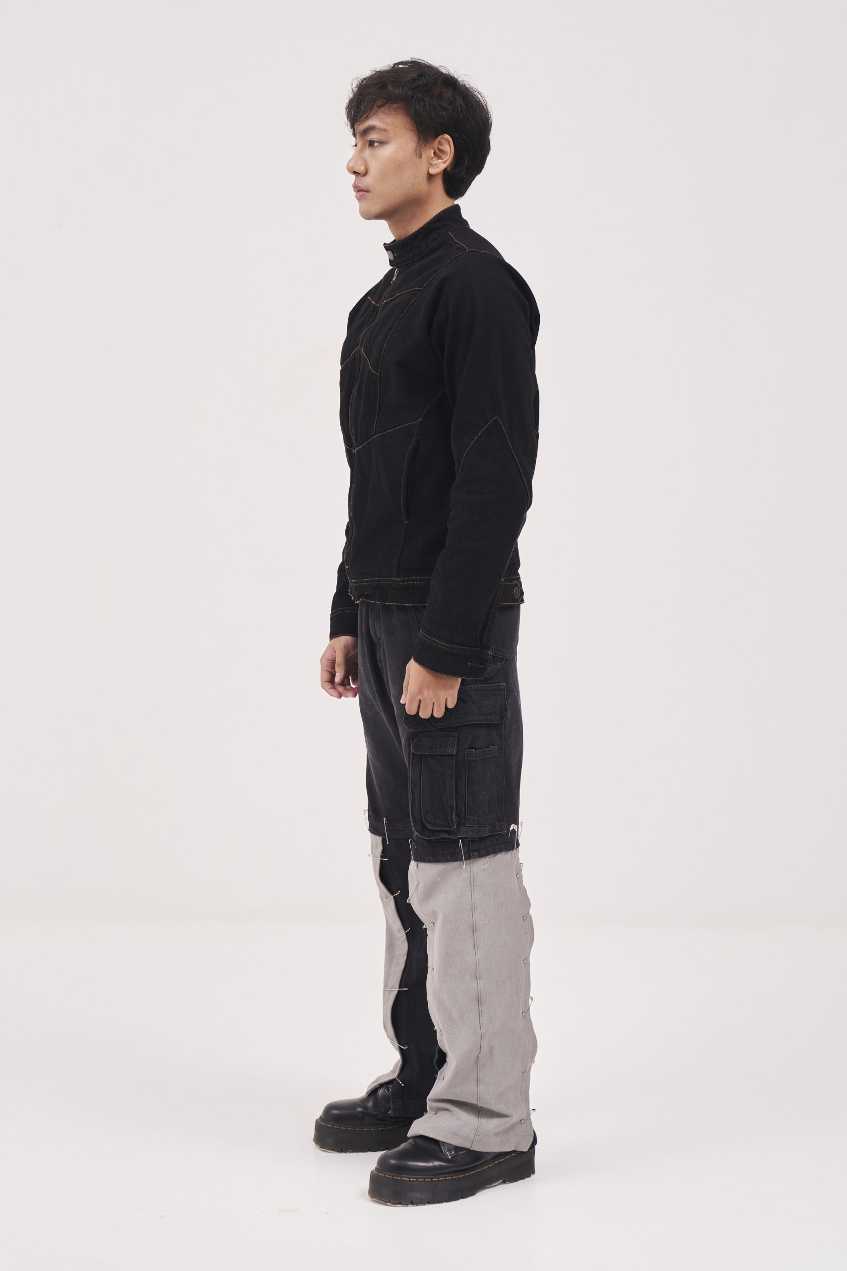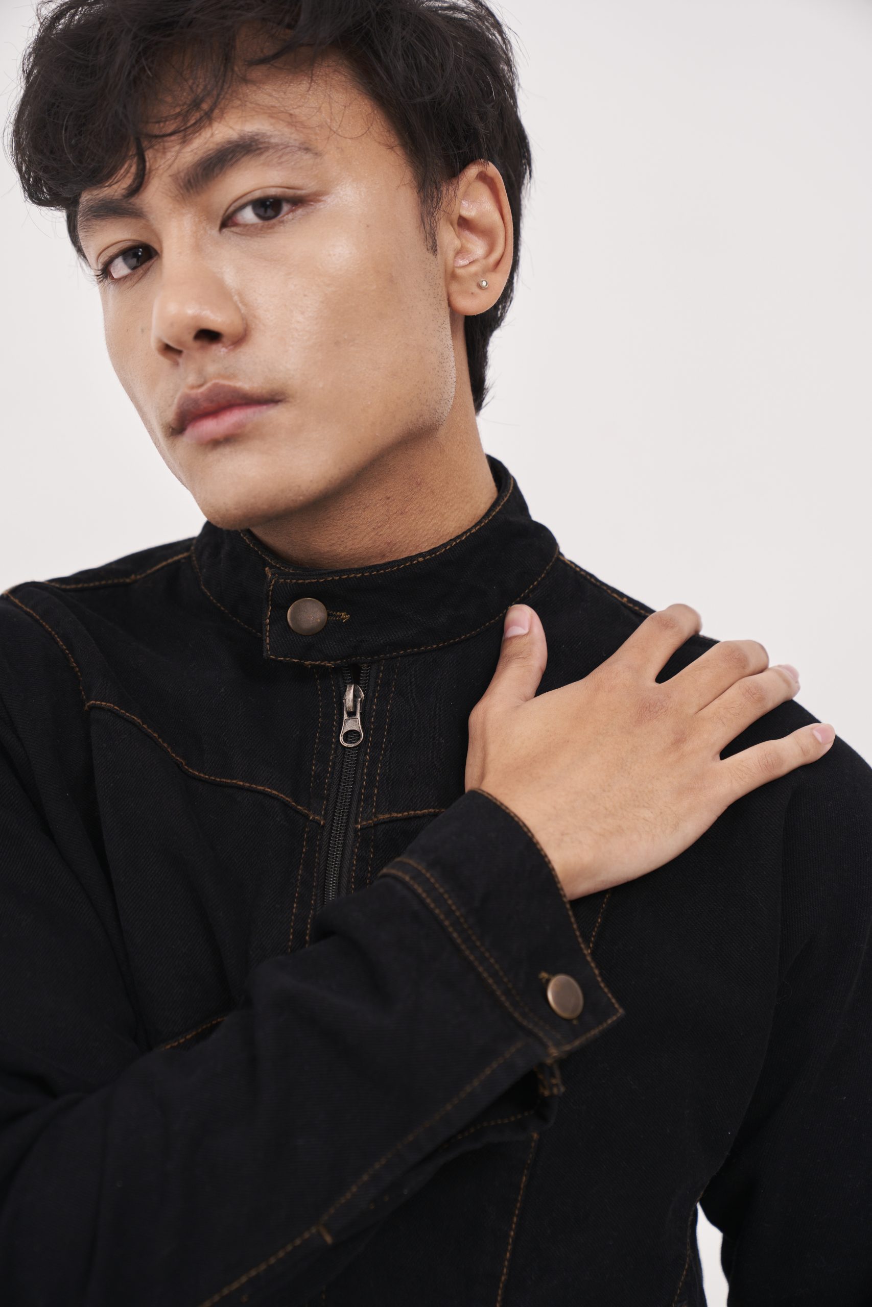 Black Denim biker jacket with button at the neck. Pockets at the front. Visible sewing as a design element.