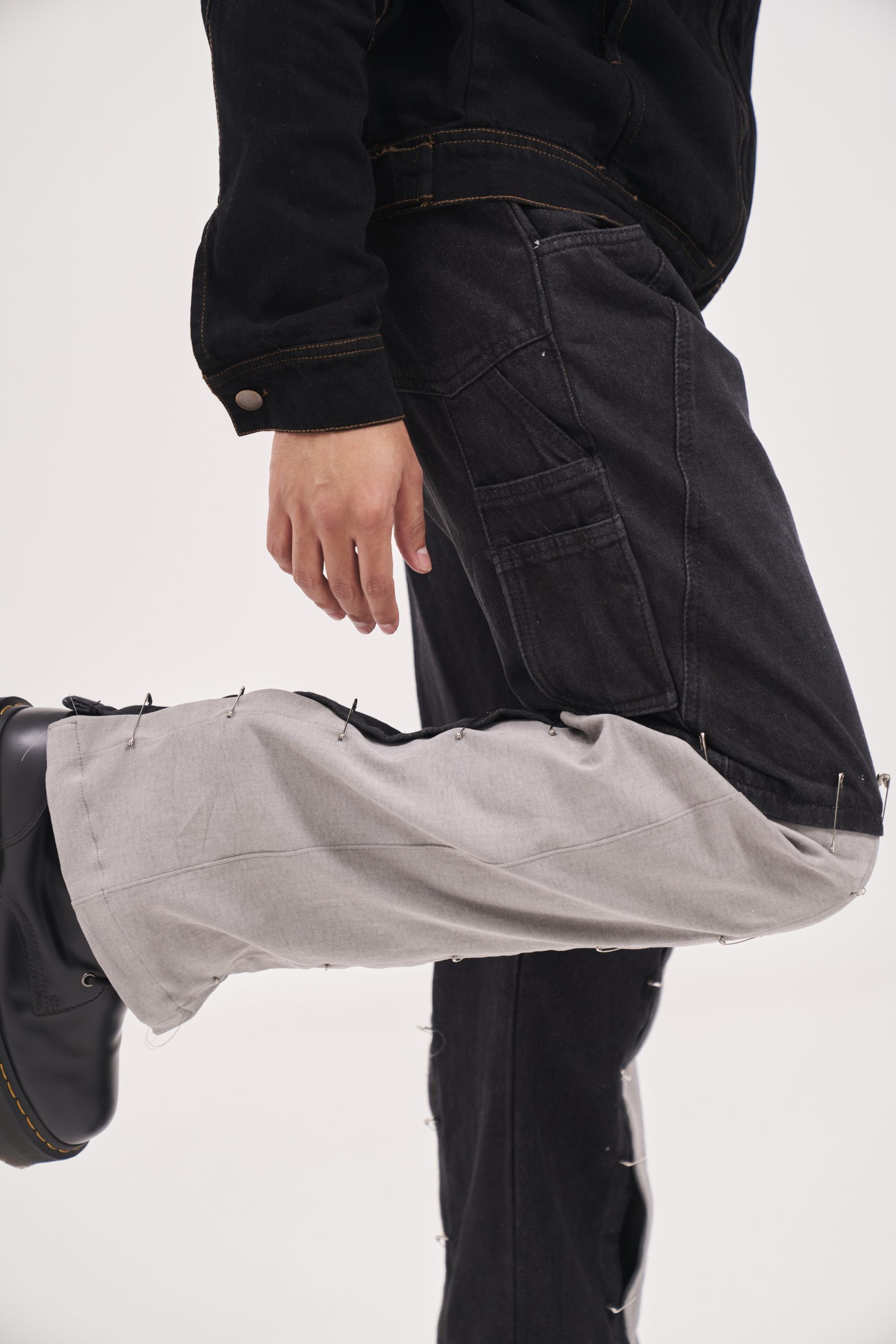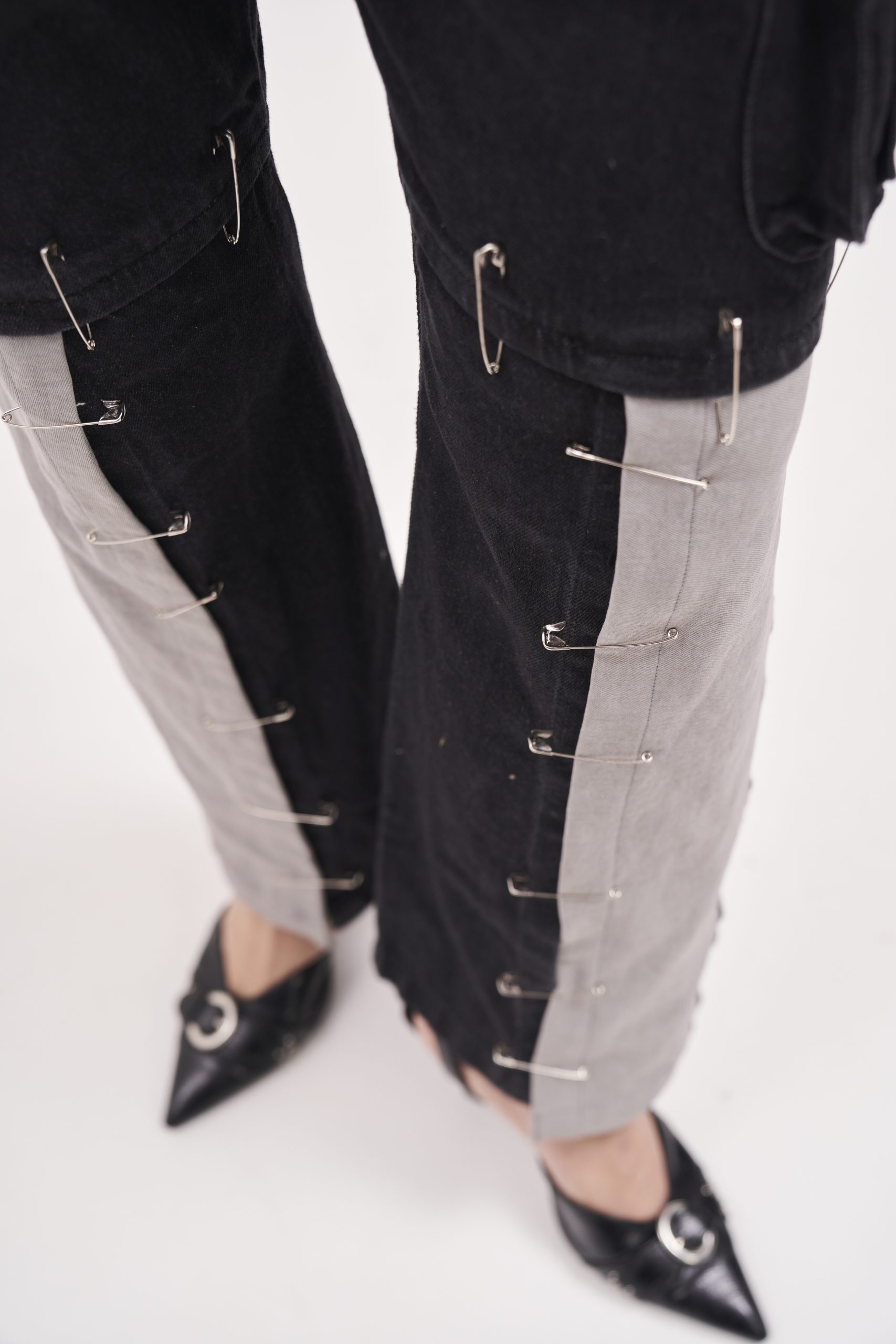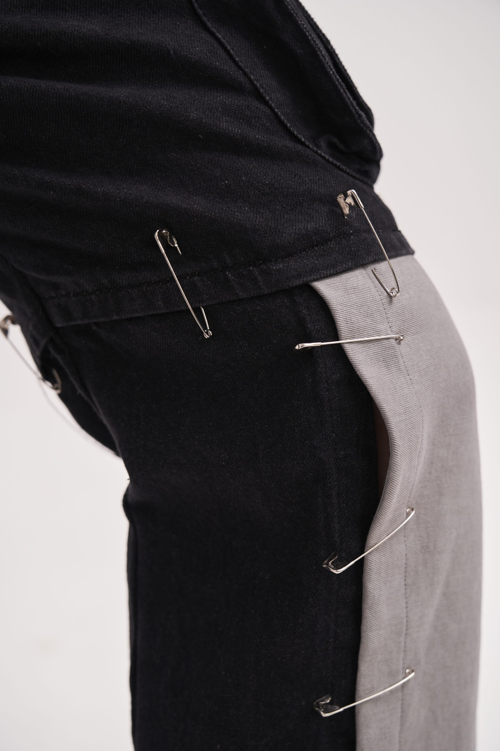 The pants are made using denim and fused with lycra denim panels. Carefully joining the two panels at the bottom using Safety pins. Multiple pocket detailing at both the thighs.