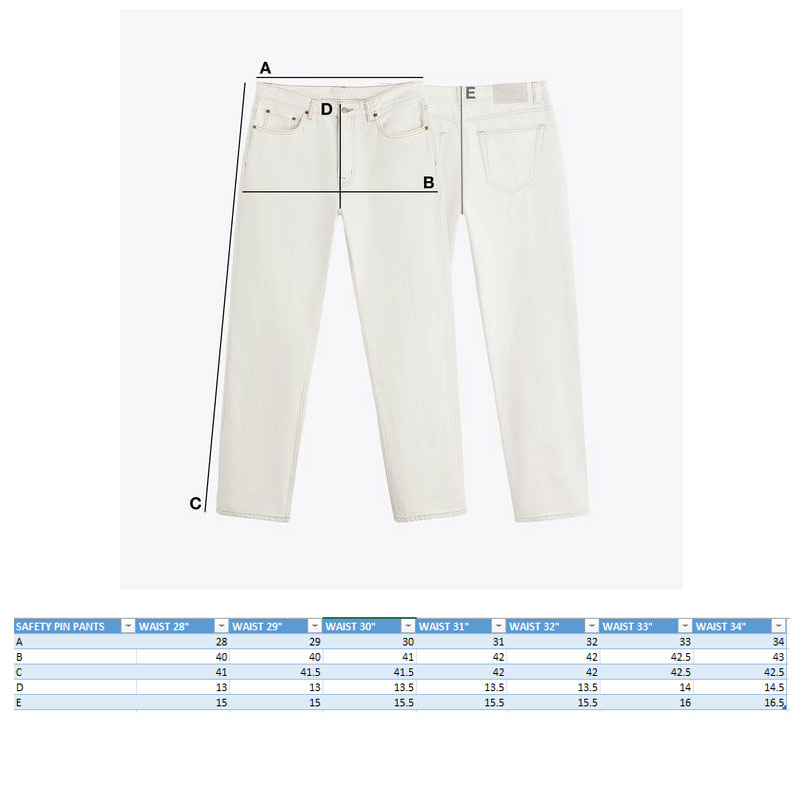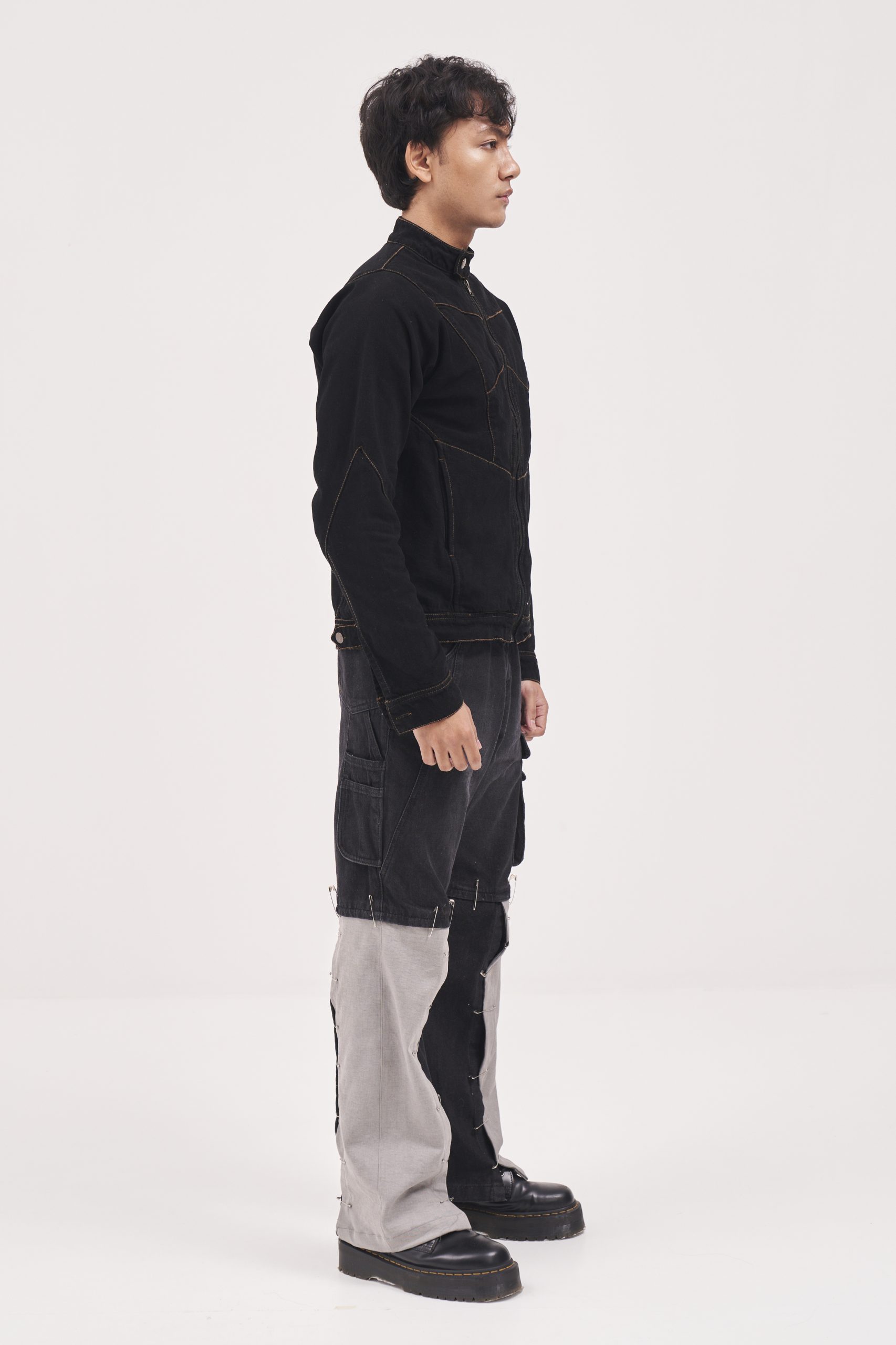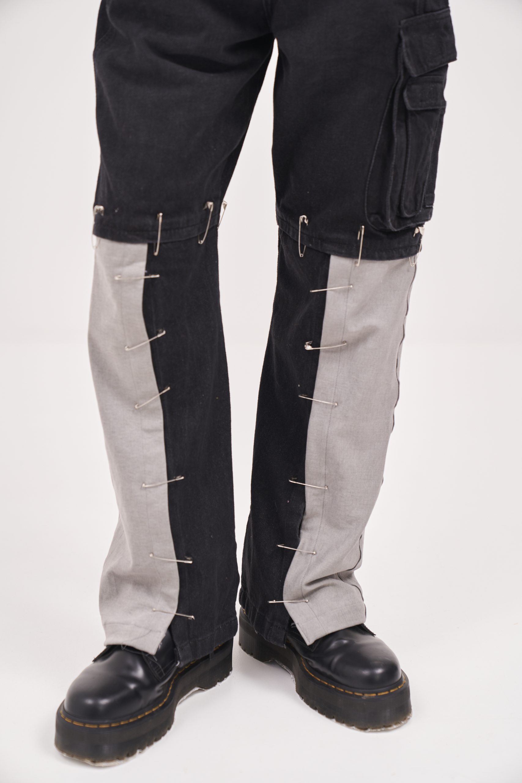 The pants are made using denim and fused with lycra denim panels. Carefully joining the two panels at the bottom using Safety pins. Multiple pocket detailing at both the thighs.